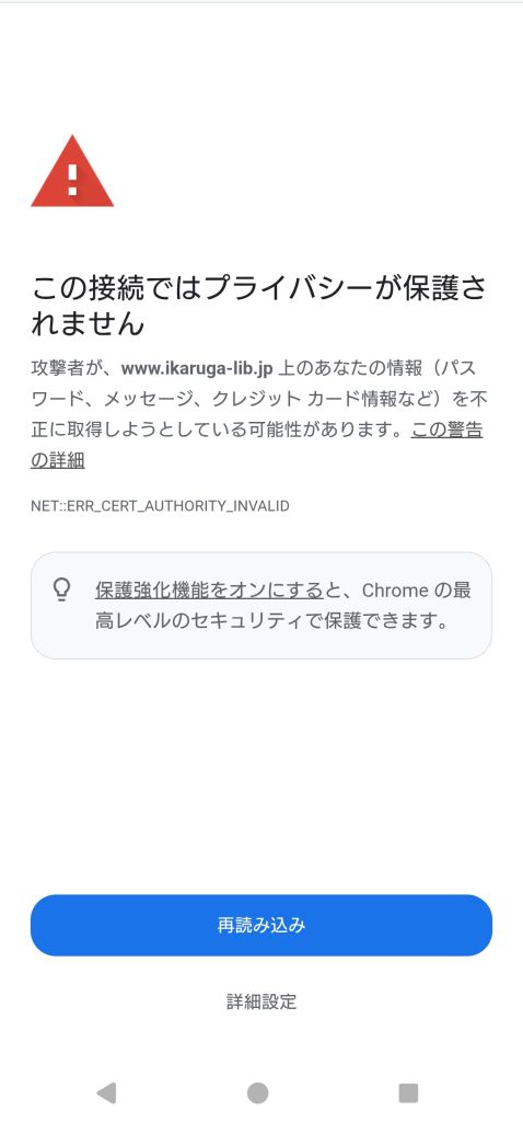 この更新作業後、お持ちの機器でアクセスすると、お持ちの機器に保存されている証明書の情報と、Webサイト(図書館ホームページ)の証明書の情報で一時的に相違が生じるため、下記のような警告画面が表示される場合があります。